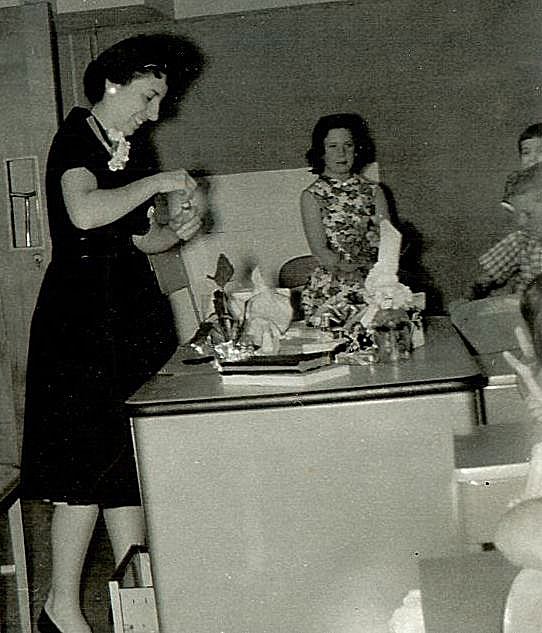 Left: Mrs. Ravosa opens a gift. Doug Kenyon and an unknown girl, possibly Cynthia Richards, are in the back. Right: Mrs. Ravosa opens a gift. Alicia Coles is in the background. Photos courtesy of Arlene Breau Wolfe.