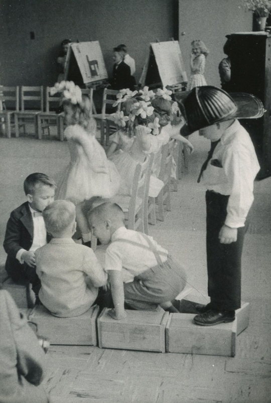 Young Folks' Kindergarten graduation photo in May 1958. The kindergarten was in the Methodist Church in the Center. Front row: Dennis Plante, Jarl Weyant, Bruce Lindwall, Scott Moore, Gail Taylor, Carol DuBois, Judith Bliss, Malcolm White, Leslie Bergeron. Row 2: Patricia Hendrick, Bruce Moore, Paul Stilphen, Brian Falk, Diane Tower, Deborah Hanson, Susan Wolcott, Christine Bortle. Row 3: Linda Bates, Peter Ouellette, Allan Phillips, Clark Swanson, Janet Betterley, Donna Anderson, Linda Mottle, Jeanne Symmes, William Kenyon, David Gallerani, Joan Stack, Stephen St. Marie. Photo courtesy of Mary Darling Studio.
